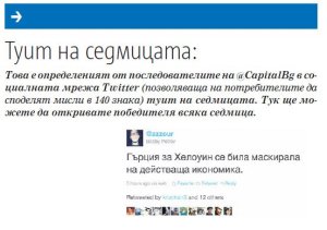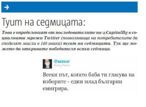В рамките на един месец (не календарен, а 30 дни), два пъти спечелих #ToW (Tweet of the Week) на вестник Капитал. Това е ежеседмична класация за най-интересния tweet в култовата социална мрежа Twitter. Екипът на Капитал подбира 10 кандидата, предложени от българското своеобразно twitter-общество, които се подлагат на гласуване и… воала!